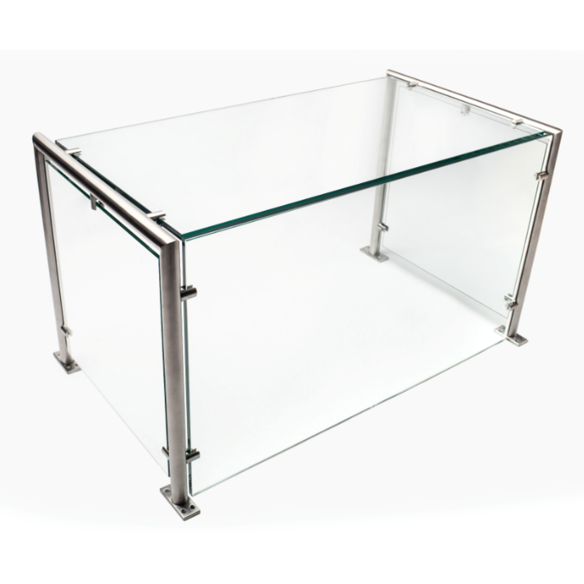 - Incluye: (1) panel superior de vidrio de 3/8", (1) panel frontal de vidrio de 3/8", (2) paneles de extremo de vidrio de 3/8", (1) paquete de herrajes y herramientas de instalación, (1) juego de instrucciones, (2) postes de extremo de acero inoxidable