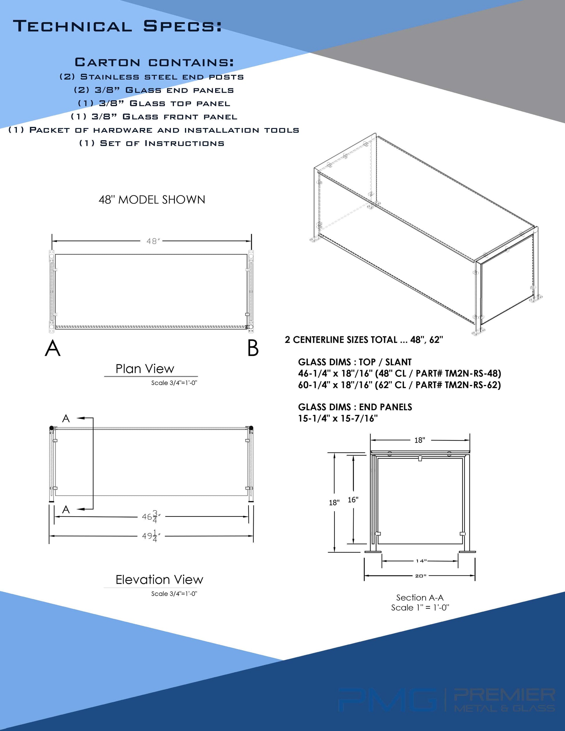- Incluye: (1) panel superior de vidrio de 3/8", (1) panel frontal de vidrio de 3/8", (2) paneles de extremo de vidrio de 3/8", (1) paquete de herrajes y herramientas de instalación, (1) juego de instrucciones, (2) postes de extremo de acero inoxidable