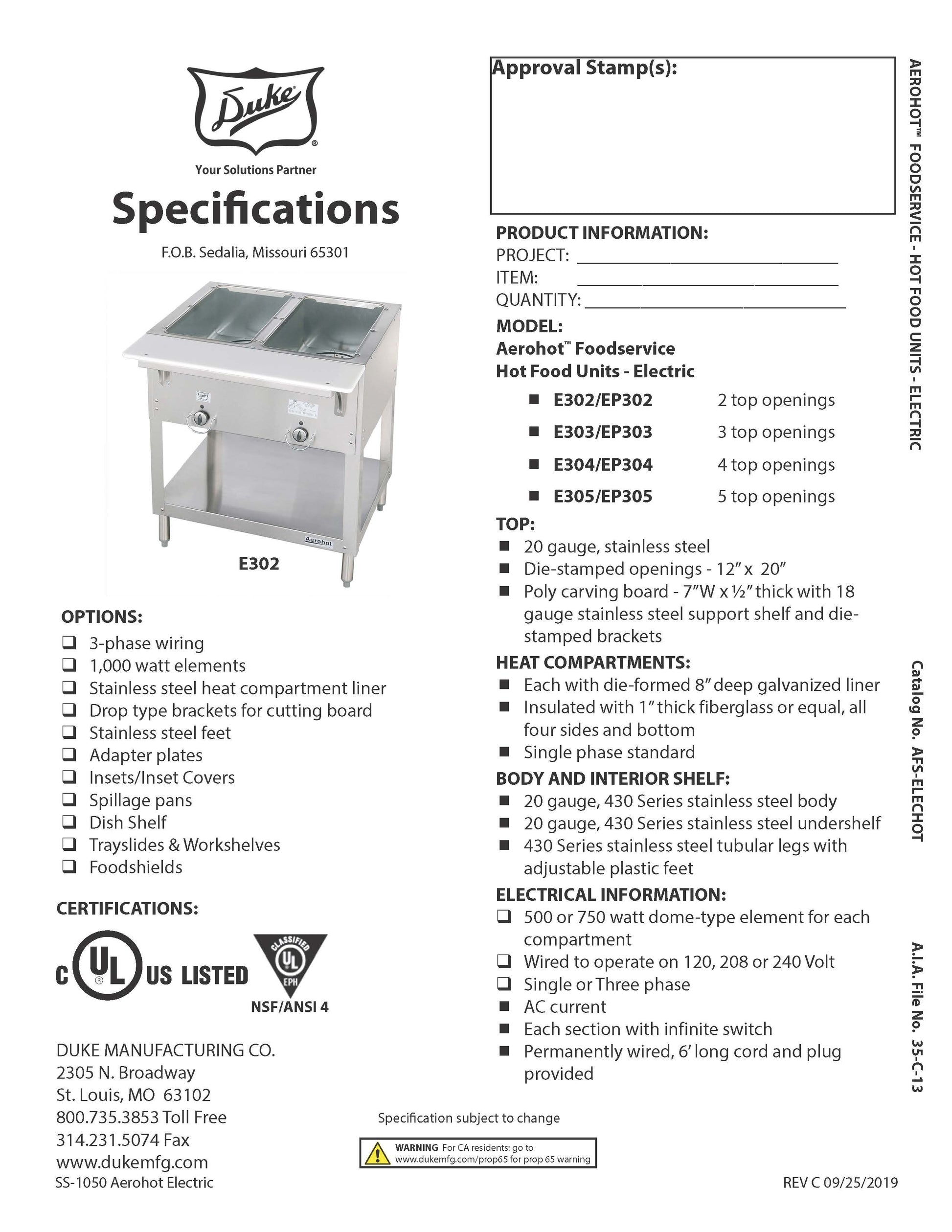 Duke Steam Table, 2 Pan Electric - 120V - E302