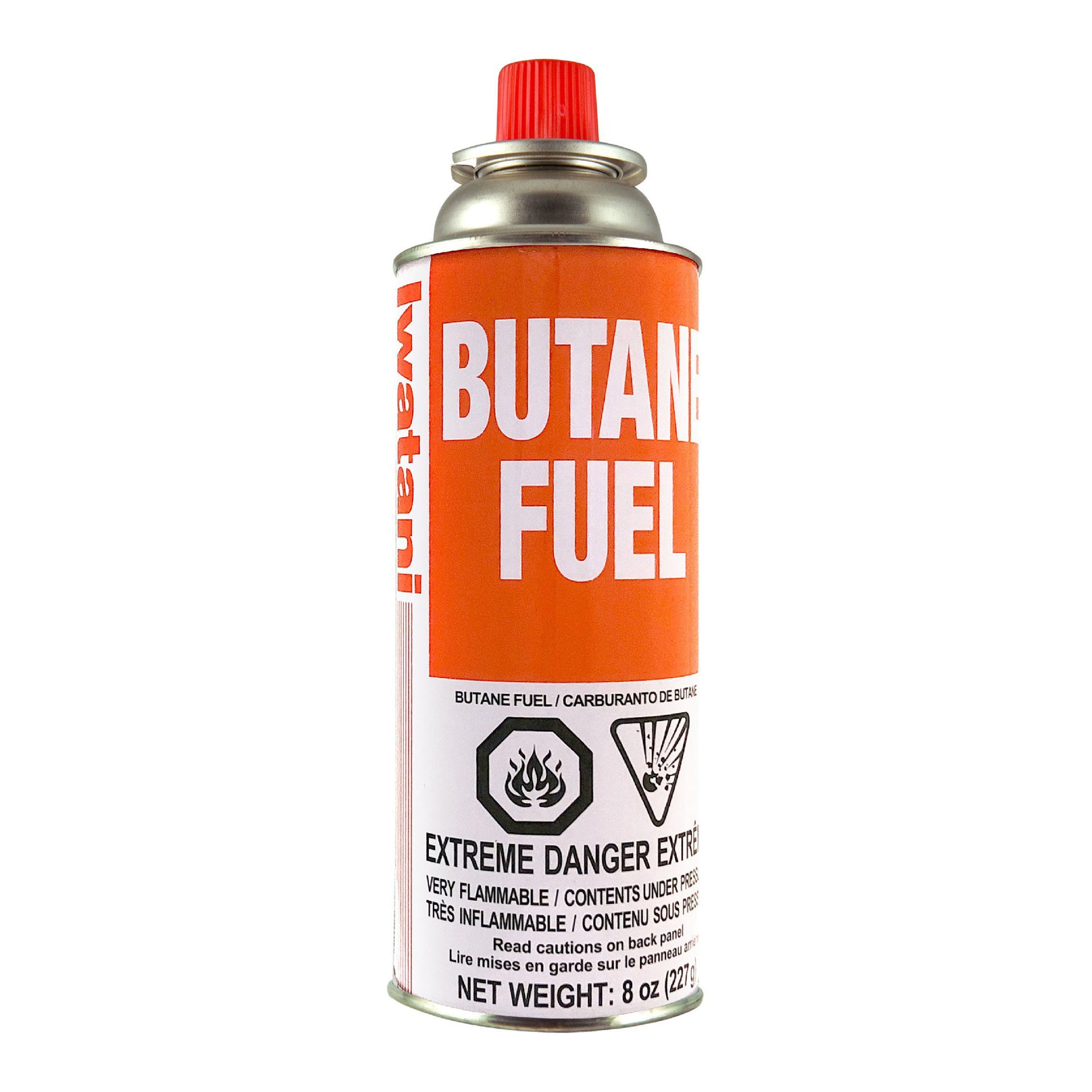8-ounce butane fuel canister with built-in safety venting and compatibility with Iwatani stovetops and torches.