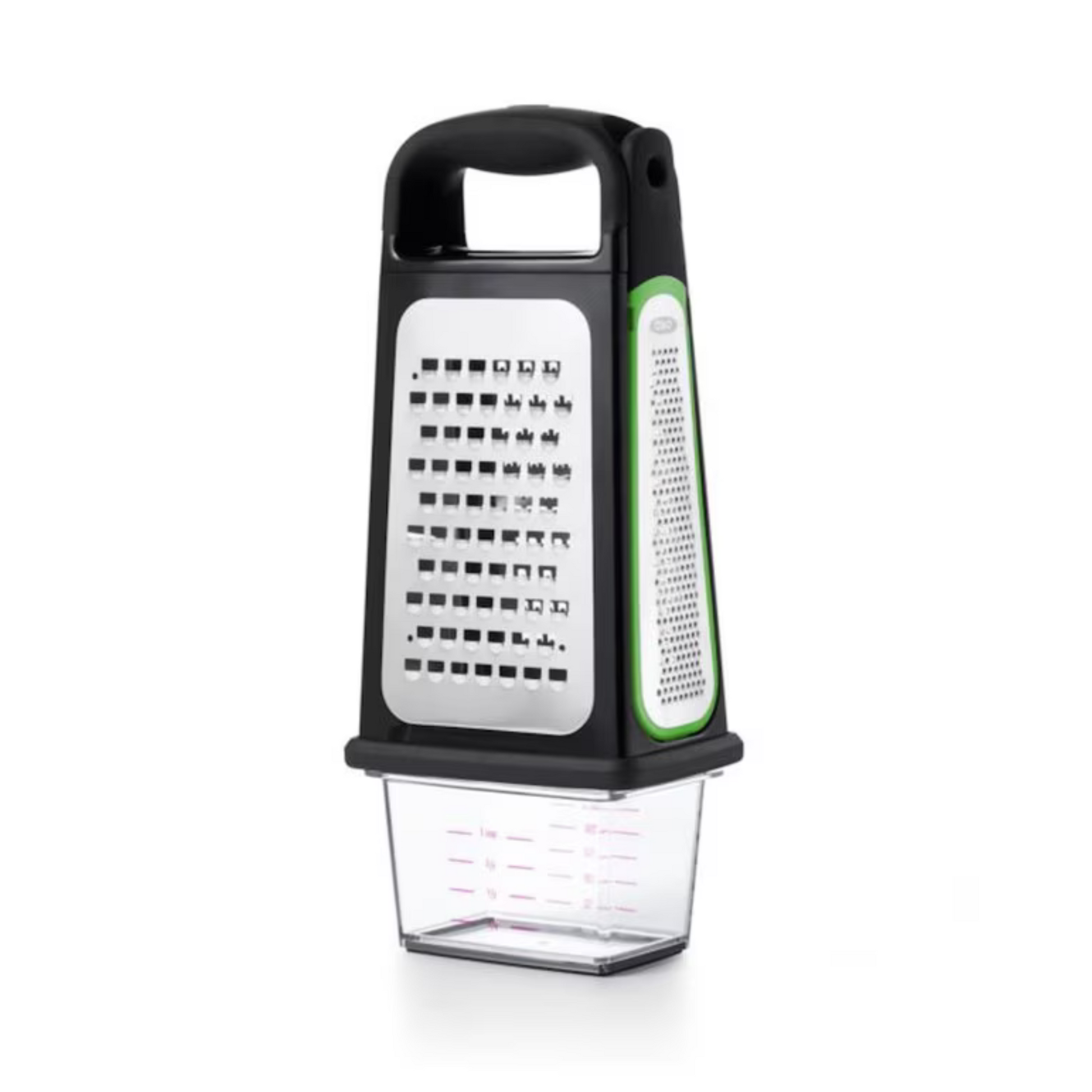 - Convenient container catches and measures freshly-grated food, and stores inside grater