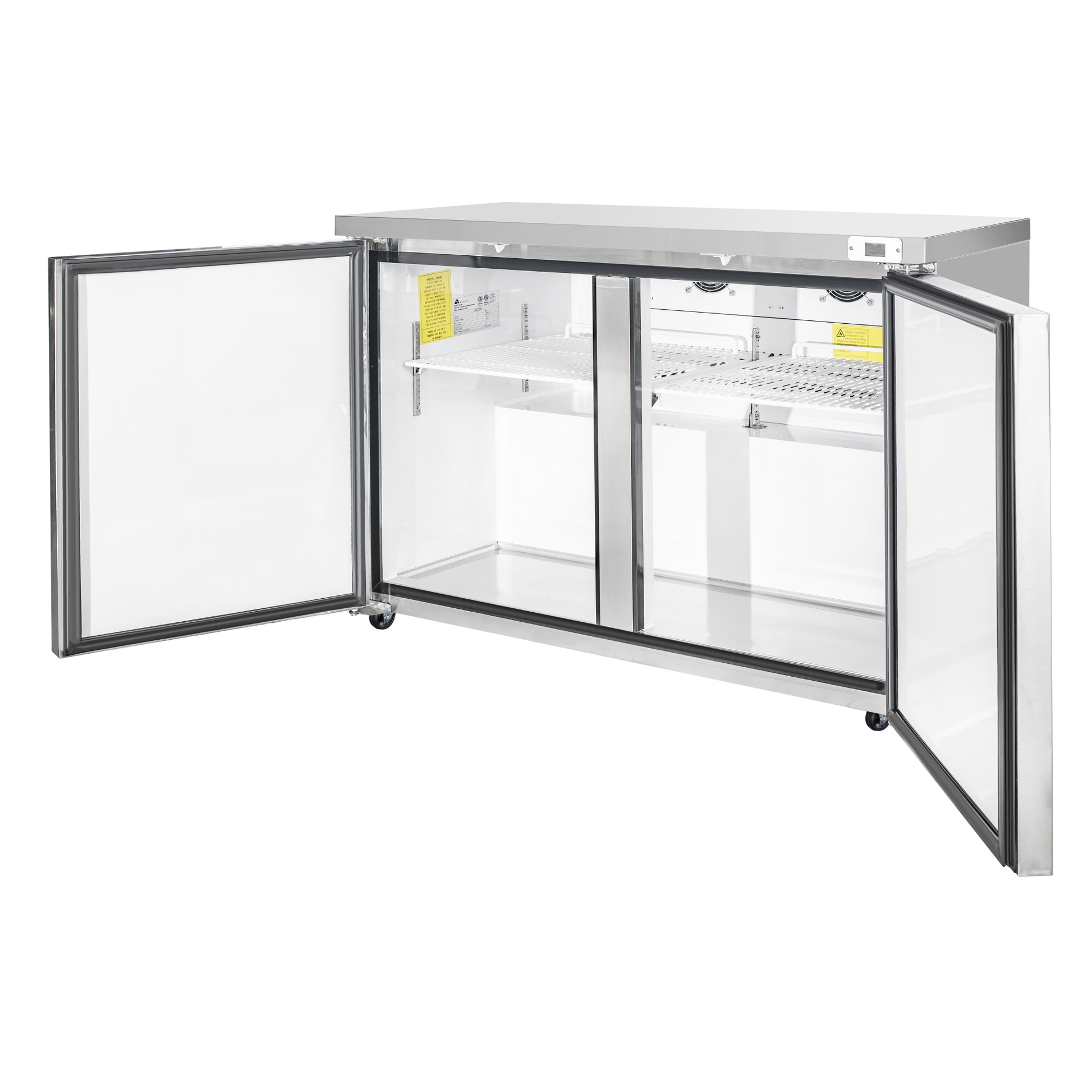 High-capacity two-door undercounter refrigerator delivering efficient cooling in a durable stainless steel design.